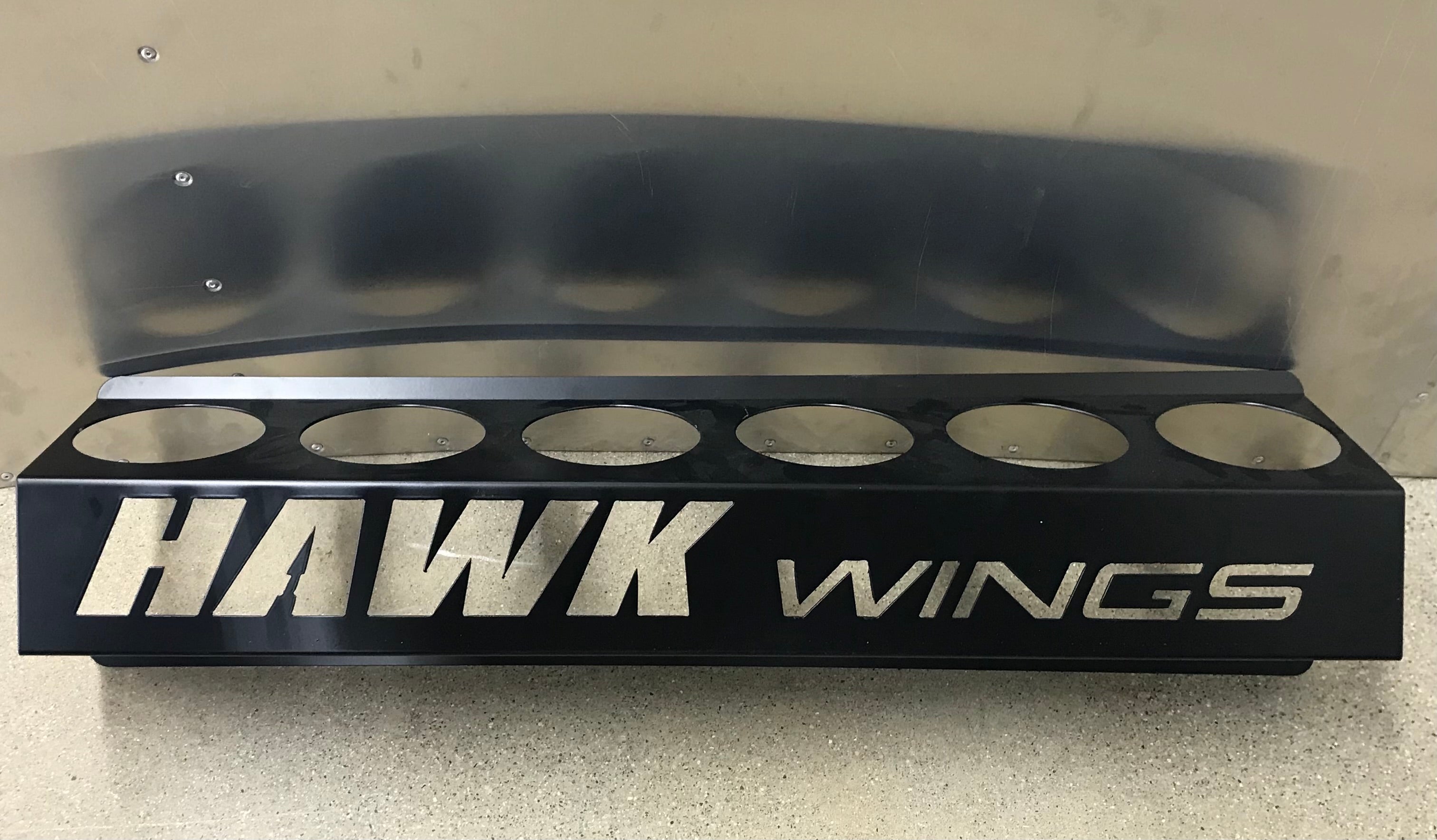 HAWK WINGS Logo Aerosol Can Trailer / Shop Wall Holder. Larger Holes for Gear Lube or larger Cans. Custom Order Options and Logo Design, Contact us!